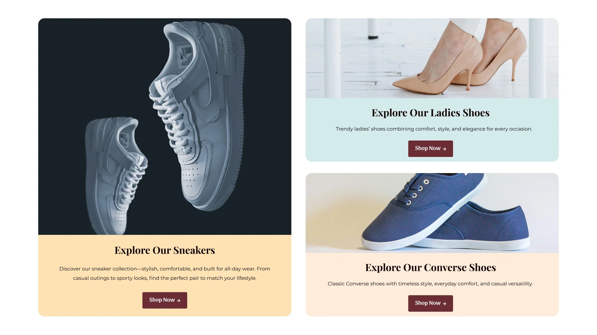 Details: This unique section is designed to guide customers to different product categories using a dynamic, asymmetrical grid layout. It combines prominent imagery with clear calls to action to dr...