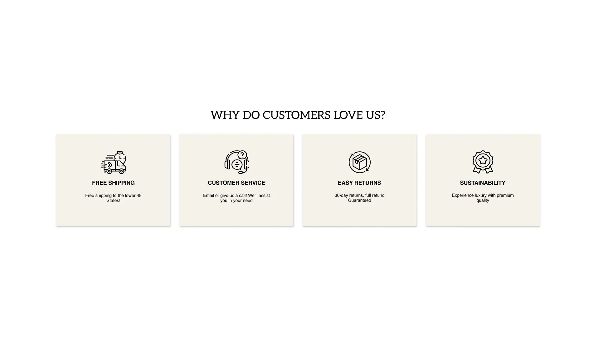 Details: This elegant section is designed to highlight your brand's key benefits and value propositions. It uses a clean, grid-based layout with simple iconography to clearly communicate why custom...