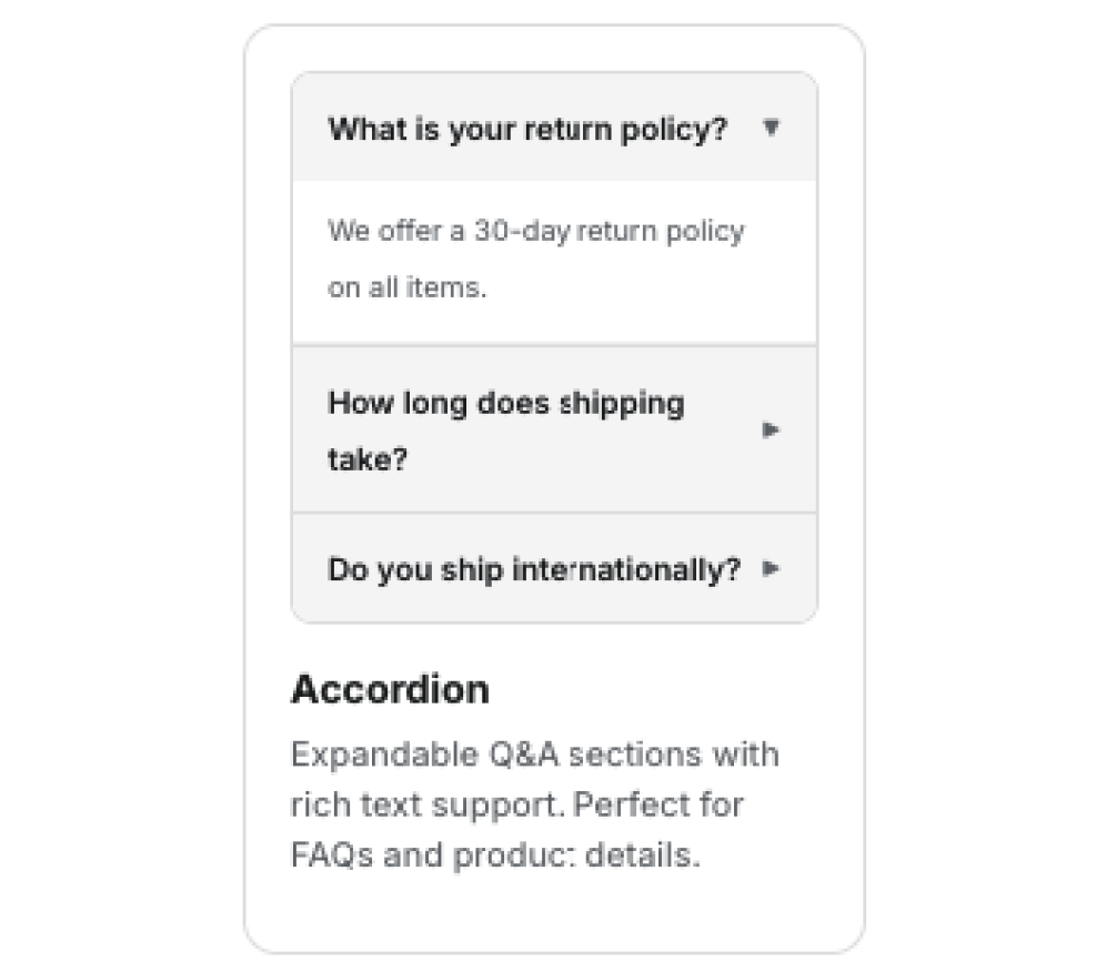 Details: Keep your page clean and organized while answering customer questions. This collapsible FAQ section helps reduce support tickets by providing instant answers in a neat list format.