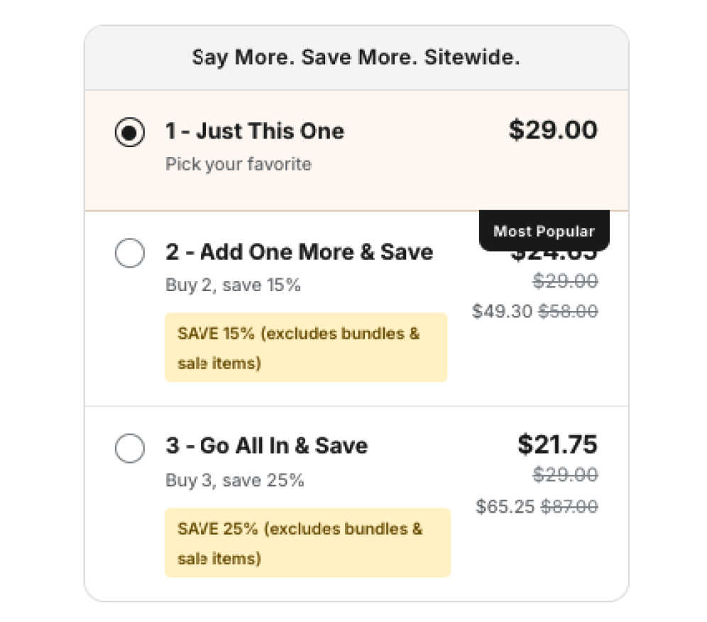 Group products together with custom discounts to increase your average order value effortlessly.