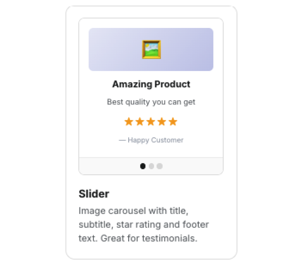 Slider Layout: A customizable carousel that displays a specified number of testimonial cards at a time. It includes navigation dots and can be configured for automatic sliding or manual swiping.